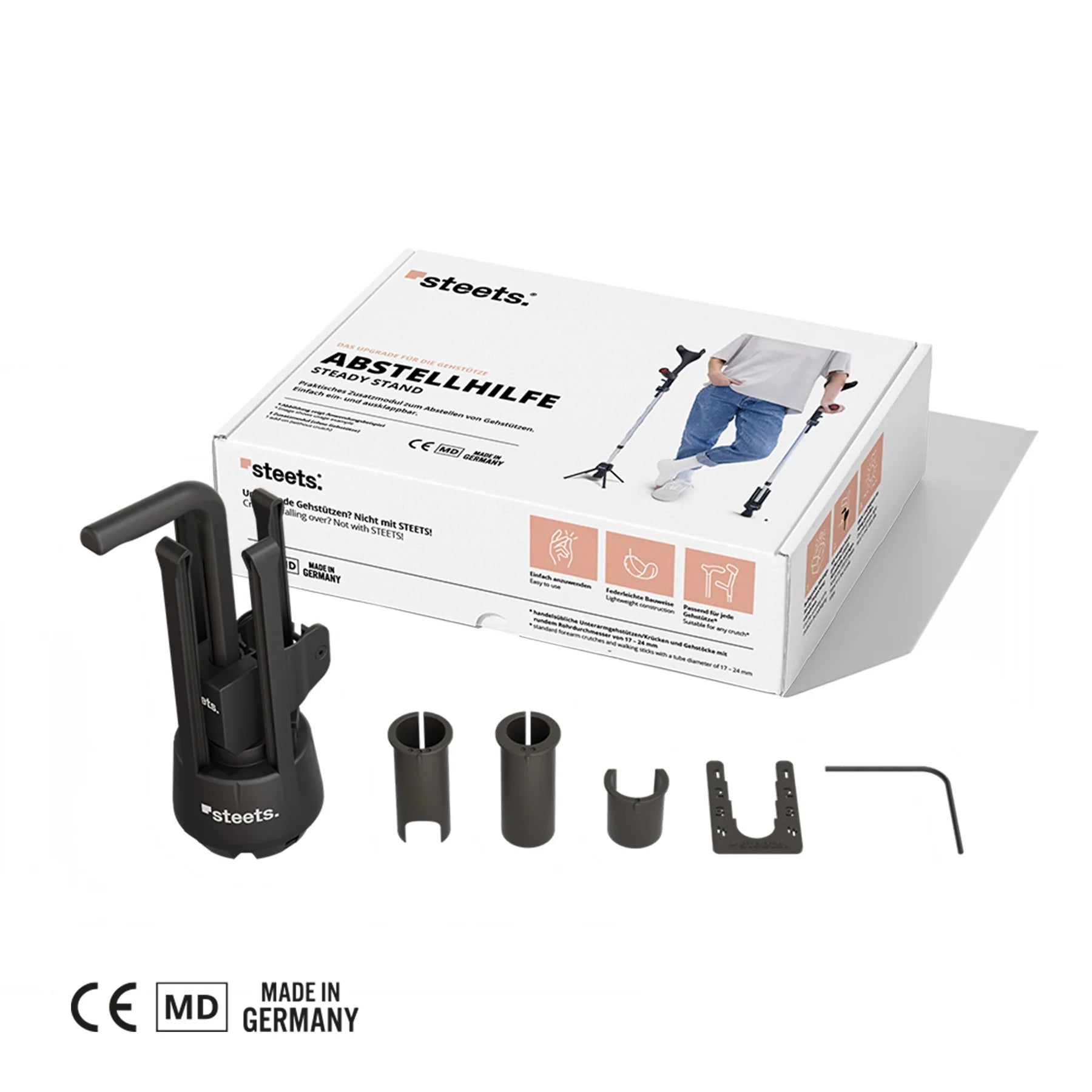 Mit nur einer Handbewegung lassen sich Gehstützen oder Gehstöcke überall sicher abstellen – ob im Wohnzimmer, in der Küche oder unterwegs. Kein lästiges Anlehnen oder lästige Sucherei mehr, denn die Gehstützen bleiben immer in greifbarer Nähe und sind schnell einsatzbereit. Die STEETS Abstellhilfe ist als Ergänzung für bereits vorhandene Gehstützen konzipiert und lässt sich mit wenigen Handgriffen an handelsübliche Gehstützen und Gehstöcke montieren.